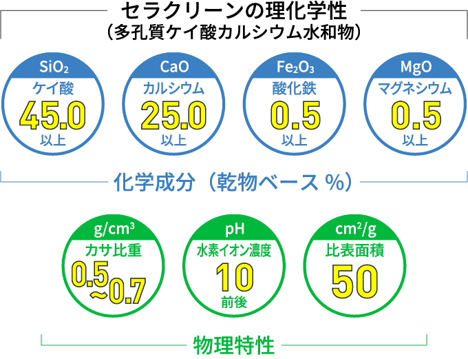 水質、底質改善のために開発されたセラクリーンは、微細で多数の孔隙を持つケイ酸カルシウム水和物です。ケイ酸カルシウム水和物は、pH、アルカリ度を安定させる強い緩衝能力を有し、空隙に有用なバクテリアを活着させます。