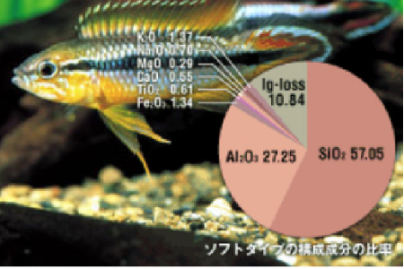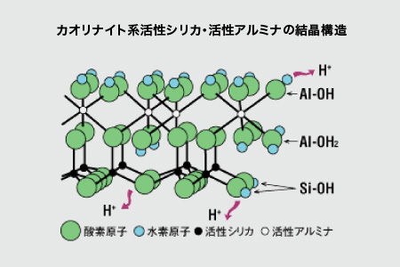 パワーハウス ソフトタイプは、カオリナイト系活性シリカ(メタカオリン)と呼ばれる鉱物を主成分としております。水のpH上昇は水中のアルカリ(水酸化物イオン、OH-)増加によるものですが、このソフトタイプは、鉱物表面に水酸化物イオンを取込みつつ酸(水素イオン)を放出する特性があるため、pHの上昇を抑制することができます。