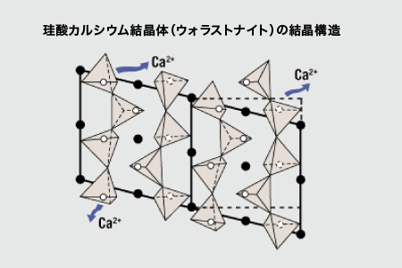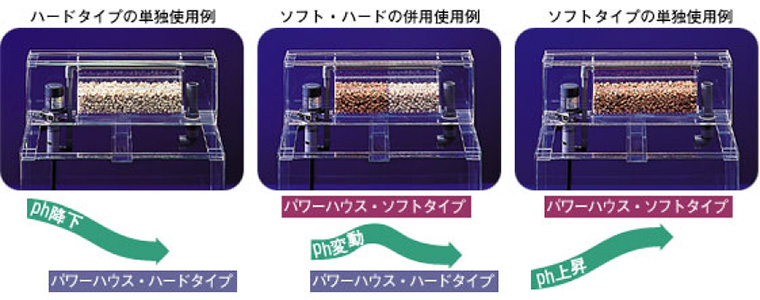パワーハウス ハードタイプは、ケイ酸カルシウム(ウォラストナイト)と呼ばれる鉱物を主成分としております。水素イオン(H+)が増加して水が酸性化すると、鉱物中のカルシウムイオンが放出されてpHの低下が抑制されます。